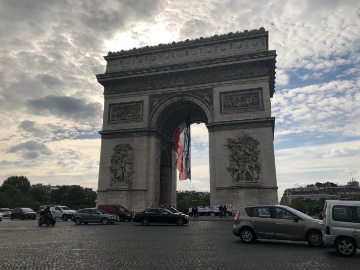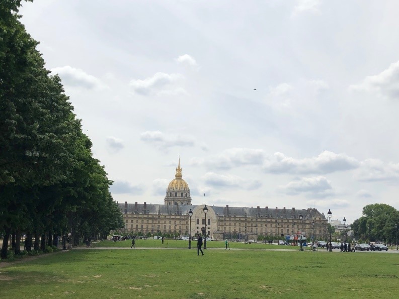 J’apprécie beaucoup la médiathèque et la bibliothèque de la Ministère où Suzelle travaille. Après être sortie de la Ministère de l’Economie et des Finances, Alain et moi, on est passés devant le pont Alexandre 3, le Grand Palais, le Petit Palais, puis, les Invalides. J’étais vraiment intéressée par la collection des armes du XVIIe siècle jusqu’à maintenant. Les lieux importants dans l’ensemble architectural des Invalides que j’ai aussi invité, c’est l’église Saint Louis, où l’empereur Napoléon Bonaparte est enterré ; et l’exposition « Picasso et la guerre » au Musée de L’Armée. Elle explore les différentes manières dont la guerre nourrit et influence l’œuvre de Picasso tout au long de son parcours artistique. On a continué la visite de l’Arc de Triomphe – le symbole des victoires de l’armée française sous l’Empire de Napoléon. Au pied de l’Arc, on a vu la Tombe du Soldat Inconnu avec une « flamme éternelle ». Il m’a expliqué aussi les noms des batailles, des généraux français dont certains d’entre eux sont morts aux combats gravés sur les quatre piliers de l’arc. Ici, il est facile de trouver l’Arche de la Défense et l’Obélisque de la place de la Concorde. On a eu la chance de voir la Cérémonie organisée marquant la Journée Nationale de la Résistance (27 mai 1943) sous l’Arc de Triomphe avec les personnes d’honneur, un orchestre. Avant de rentrer, on s’est baladés aux Champs-Elysées – une célèbre avenue, un lieu incontournable du shopping et des monuments prestigieux.
