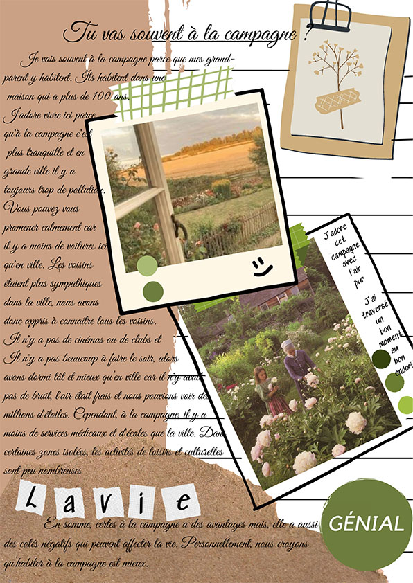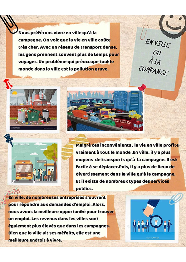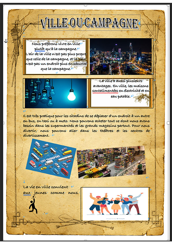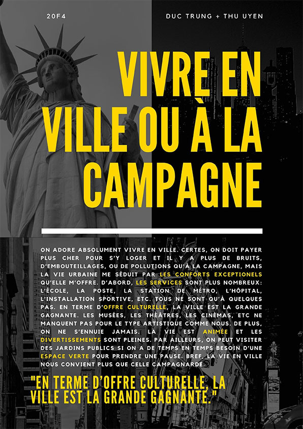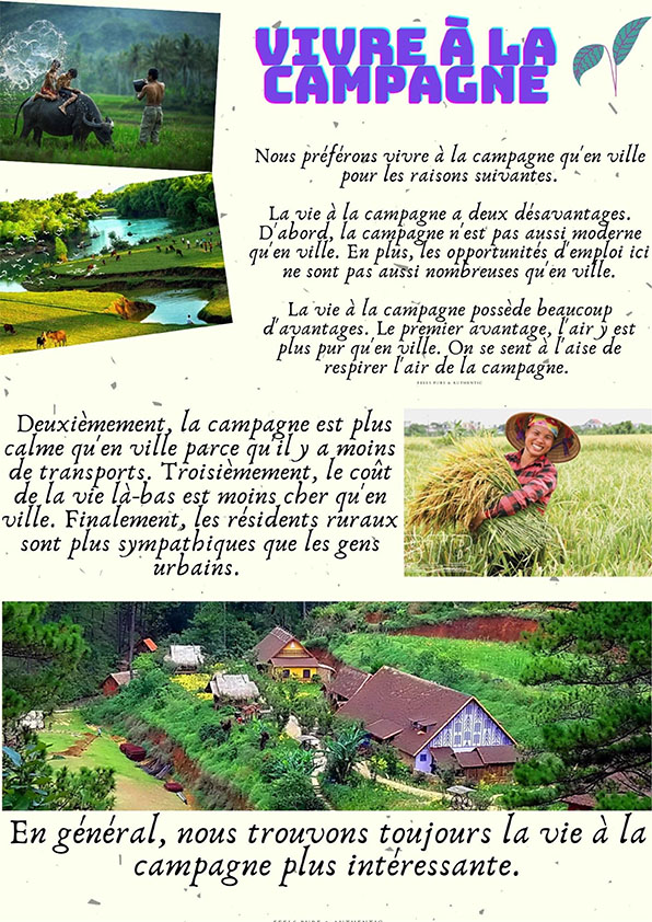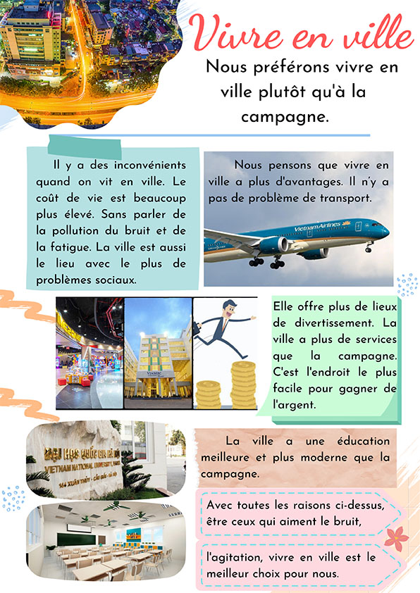 Les étudiants, en première année de langue française de l’université nationale de Ha Noï, commencent à faire connaissance avec l’argumentation en français. Quoi de mieux pour ce premier exercice que d’aborder l’épineux et universel choix de lieu de vie. Tout en illustration et argumentation, les élèves nous présentent leurs travaux réalisés seul ou en groupe. La crise sanitaire n’épargnant personne, comme tous les étudiants, ceux de Thuy continuent de travailler en ligne et chacun a pu laisser libre cours à son inspiration pour traiter le sujet.