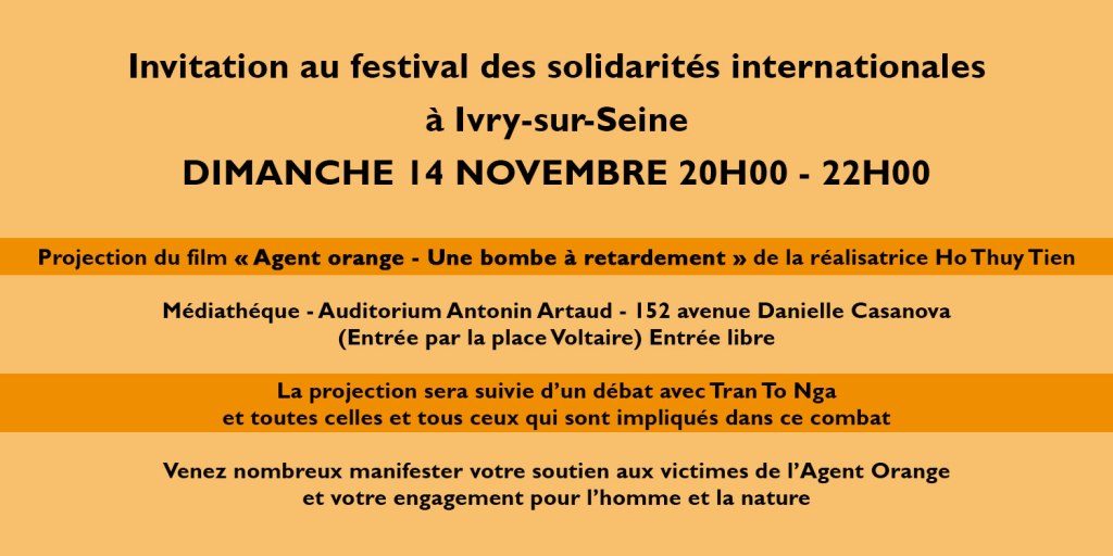 Dans le cadre du Festival des Solidarités internationales à Ivry-sur-Seine, nous vous invitons à nous rejoindre le dimanche 14 novembre au soir. Vous pourrez voir, ou revoir, le film « Agent Orange – Une bombe à retardement », rencontrer Tran to Nga, une des victimes de cet écocide, acheter son livre « Ma terre empoisonnée » et contribuer au débat sur la pollution sanitaire et environnementale qui nous concerne toutes et tous, citoyens du monde, responsables associatifs et syndicaux, élus, chercheurs, médecins, …