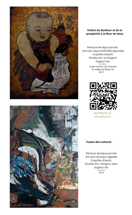 Raphaël Verdon, HironPhoenix de son nom d’artiste, est né au Vietnam ; il est venu très jeune en France où il pratique cette discipline exigeante qu’est la laque végétale poncée ; il met en oeuvre les règles de l’art des meilleures grandes écoles de Hanoi où il a été formé par des artistes laqueurs vietnamiens à l’occasion de plusieurs séjours au Vietnam, notamment en 2014, 2019, 2020, 2023 et 2024.